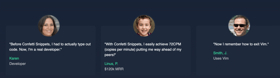Confetti Snippets 是一个浏览器插件,功能很简单,就是给 Stack Overflow 的评论区代码段加一个复制按钮。这个网站上面的寄语很搞笑,随便翻译一段:在遇见 Confetti Snippets 之前,我还得自己一行一行㪣代码,现在,我终于变成了真正的开发者,编码水平遥遥领先于同龄人!