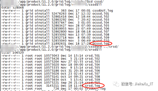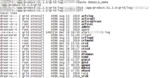 JiekeXur2:/app/product/11.2.0/grid/log/JiekeXur2$echo $ORACLE_HOME/app/product/11.2.0/gridJiekeXur2:/app/product/11.2.0/grid/log/JiekeXur2$cd app/product/11.2.0/grid/log/JiekeXur2/JiekeXur2:/app/product/11.2.0/grid/log/JiekeXur2$ll alert*-rw-rw-r-- 1 gridoinstall 1483455 Dec 18 17:25 alertJiekeXur2.log