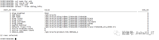 SYS@JiekeCDB>col NAME for a30SYS@JiekeCDB>col VALUE for a88SYS@JiekeCDB>set line 456SYS@JiekeCDB>select * from v$diag_info;INST_ID NAME VALUE CON_ID---------------------------------------- --------------------------------------------------------------------------------------------------1 Diag Enabled TRUE 01 ADR Base opt/oracle 01 ADR Home opt/oracle/diag/rdbms/jiekecdb/JiekeCDB 01 Diag Trace opt/oracle/diag/rdbms/jiekecdb/JiekeCDB/trace 01 Diag Alert opt/oracle/diag/rdbms/jiekecdb/JiekeCDB/alert 01 Diag Incident opt/oracle/diag/rdbms/jiekecdb/JiekeCDB/incident 01 Diag Cdump opt/oracle/diag/rdbms/jiekecdb/JiekeCDB/cdump 01 Health Monitor opt/oracle/diag/rdbms/jiekecdb/JiekeCDB/hm 01 Default Trace File opt/oracle/diag/rdbms/jiekecdb/JiekeCDB/trace/JiekeCDB_ora_6468.trc 01 Active Problem Count 0 01 Active Incident Count 0 01 ORACLE_HOME opt/oracle/product/19c/dbhome_1 012 rows selected.
