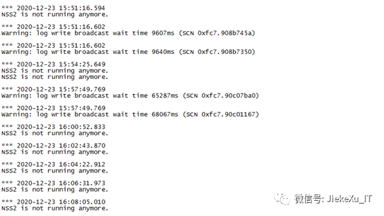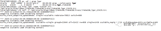 [oracle@JiekeXu~]$ ps -ef | grep lgwroracle 6597 18080 0 18:03 pts/1 00:00:00 grep--color=auto lgwroracle 15429 1 0 Dec02 ? 00:01:19 ora_lgwr_JiekeCDB[oracle@JiekeXu~]$ find opt -name *15429*.trc/opt/oracle/diag/rdbms/jiekecdb/JiekeCDB/trace/JiekeCDB_lgwr_15429.trc[oracle@JiekeXu~]$ tail -f opt/oracle/diag/rdbms/jiekecdb/JiekeCDB/trace/JiekeCDB_lgwr_15429.trc***2020-12-13T10:35:33.746113+08:00 (CDB$ROOT(1))Adaptive scalableLGWR disabling workerskcrfw_slave_adaptive_updatemode:single->scalable redorate=78013 switch=668***2020-12-13T14:04:09.009604+08:00 (CDB$ROOT(1))Adaptive scalableLGWR enabling workerskcrfw_slave_adaptive_updatemode:scalable->single group0=22646 all=31422 rw=808 single=1436scalable_nopipe=1616 scalable_pipe=1212 scalable=1459***2020-12-14T22:00:12.018302+08:00 (CDB$ROOT(1))Adaptive scalableLGWR disabling workers