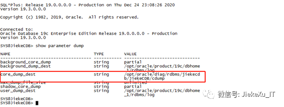 JiekeXur2:/home/grid$sqlplus as sysasmSQL*Plus: Release11.2.0.4.0 Production on Fri Dec 18 17:13:19 2020Copyright (c)1982, 2013, Oracle. All rights reserved.Connected to:Oracle Database11g Enterprise Edition Release 11.2.0.4.0 - 64bit ProductionWith the RealApplication Clusters and Automatic Storage Management optionsSQL> showparameter dumpNAME TYPE VALUE--------------------------------------------------------------------- ------------------------------background_core_dump string partialbackground_dump_dest string /app/grid/diag/asm/+asm/+ASM2/tracecore_dump_dest string /app/grid/diag/asm/+asm/+ASM2/cdumpmax_dump_file_size string 100Mshadow_core_dump string partialuser_dump_dest string /app/grid/diag/asm/+asm/+ASM2/trace