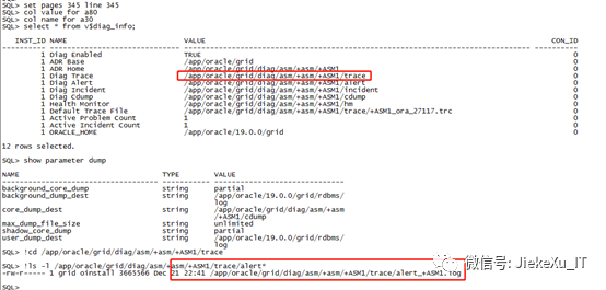 SQL> set line456 pages 345SQL> col NAMEfor a30SQL> col VALUEfor a88SQL> select * from v$diag_info;INST_ID NAME VALUE---------------------------------------- ----------------------------------------------------------------------------------------2 Diag Enabled TRUE2 ADR Base app/oracle2 ADR Home app/oracle/diag/rdbms/Jiekedb/Jiekedb22 Diag Trace app/oracle/diag/rdbms/Jiekedb/Jiekedb2/trace2 Diag Alert app/oracle/diag/rdbms/Jiekedb/Jiekedb2/alert2 Diag Incident app/oracle/diag/rdbms/Jiekedb/Jiekedb2/incident2 Diag Cdump app/oracle/diag/rdbms/Jiekedb/Jiekedb2/cdump2 Health Monitor app/oracle/diag/rdbms/Jiekedb/Jiekedb2/hm2 Default Trace File app/oracle/diag/rdbms/Jiekedb/Jiekedb2/trace/Jiekedb2_ora_1212.trc2 Active Problem Count 22 Active Incident Count 511 rows selected.SQL> showparameter dumpNAME TYPE VALUE----------------------------------------------- ------------------------------background_core_dump string partialbackground_dump_dest string /app/oracle/diag/rdbms/Jiekedb/Jiekedb2/tracecore_dump_dest string /app/oracle/diag/rdbms/Jiekedb/Jiekedb2/cdumpmax_dump_file_size string unlimitedshadow_core_dump string partialuser_dump_dest string /app/oracle/diag/rdbms/Jiekedb/Jiekedb2/trace