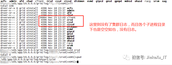 如上图,此目录下已经没有集群日志 alertJiekeXur1.log 了,crsd、cssd、gipcd 等集群进程目录下也没有相关日志信息了,那么集群日志到底在什么位置呢?我们来一起看看吧。