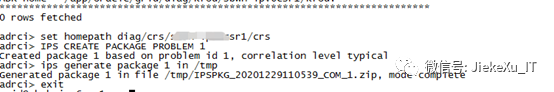 ADR Home =/app/oracle/grid/diag/asm/+asm/+ASM1:*************************************************************************PROBLEM_ID PROBLEM_KEY LAST_INCIDENT LASTINC_TIME--------------------------------------------------------------------------------------------------- ----------------------------------------1 ORA 7445 [kghidmp_new] 158689 2020-10-10 10:17:21.841000 +08:00adrci> sethomepath diag/crs/Jieker1/crsadrci> IPSCREATE PACKAGE PROBLEM 1Created package 1based on problem id 1, correlation level typicaladrci> ipsgenerate package 1 in /tmpGenerated package1 in file /tmp/IPSPKG_20201229110539_COM_1.zip, mode completeadrci> exit