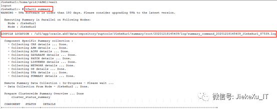ps -ef | grep -itfa<TFA_HOME>/bin/tfactl diagcollect -all -from ”Jun/19/2018 11:00:00“ -to” Jun/19/2018 14:00:00“/app/product/11.2.0/grid/tfa/Jieker1/tfa_home/bin/tfactl diagcollect -all -from "DEC/28/2020 09:30:00" -to "DEC/28/2020 11:00:00"--查看 TFA 运行情况Jieker1:~ # ps -ef| grep -i tfaroot 27780 60312 0 09:18 pts/0 00:00:00 grep -i tfaroot 66166 1 0 Jul17 ? 01:38:39 /bin/sh /etc/init.d/init.tfarungrid 66652 1 0 Jul17 ? 05:03:19 /bin/sh ./OSWatcher.sh 30 48NONE /app/grid/tfa/repository/suptools/Jieker1/oswbb/grid/archivegrid 67873 66652 0 Jul17 ? 00:42:05 /bin/sh ./OSWatcherFM.sh 48/app/grid/tfa/repository/suptools/Jieker1/oswbb/grid/archiveroot 78089 1 0 Jul17 ? 1-09:42:39 /app/product/11.2.0/grid/jdk/jre/bin/java-Xms128m -Xmx512m oracle.rat.tfa.TFAMain/app/product/11.2.0/grid/tfa/Jieker1/tfa_home--使用 TFA 收集一段时间的日志Jieker1:~ #/app/product/11.2.0/grid/tfa/Jieker1/tfa_home/bin/tfactl diagcollect -all -from"DEC/28/2020 09:30:00" -to "DEC/28/2020 11:00:00"Collecting datafor all components using above parameters...Collecting datafor all nodesScanning filesfrom DEC/28/2020 09:30:00 to DEC/28/2020 11:00:00Collection Id :20201229091823Jieker1RepositoryLocation in Jieker1 : /app/grid/tfa/repositoryCollection monitorwill wait up to 60 seconds for collections to start2020/12/29 09:18:25 CST : NOTE : Any file or directory name containing the string .comwill be renamed to replace .com with dotcom2020/12/29 09:18:25 CST : Collection Name : tfa_Tue_Dec_29_09_18_23_CST_2020.zip2020/12/29 09:18:25 CST : Sending diagcollect request to host : Jieker22020/12/29 09:18:25 CST : Scanning of files for Collection in progress...2020/12/29 09:18:25 CST : Collecting extra files...2020/12/29 09:19:33 CST : Getting list of files satisfying time range [12/28/2020 09:30:00CST, 12/28/2020 11:00:00 CST]2020/12/29 09:19:33 CST : Starting Thread to identify stored files to collect2020/12/29 09:19:33 CST : Getting List of Files to Collect…………2020/12/29 09:21:17 CST : Zip file size : 8.5MB2020/12/29 09:21:17 CST : Total time taken : 172s2020/12/29 09:21:17 CST : Remote Collection in Progress...2020/12/29 09:21:17 CST : Jieker2:Completed Collection2020/12/29 09:21:17 CST : Completed collection of zip files.Logs are beingcollected to:/app/grid/tfa/repository/collection_Tue_Dec_29_09_18_23_CST_2020_node_all/app/grid/tfa/repository/collection_Tue_Dec_29_09_18_23_CST_2020_node_all/Jieker1.tfa_Tue_Dec_29_09_18_23_CST_2020.zip/app/grid/tfa/repository/collection_Tue_Dec_29_09_18_23_CST_2020_node_all/Jieker2.tfa_Tue_Dec_29_09_18_23_CST_2020.zip--简单查看日志路径及内容Jieker1:/app/grid/tfa/repository/collection_Tue_Dec_29_09_18_23_CST_2020_node_all# ls -lrttotal 16612-rwx------ 1 rootroot 1198 Dec 29 09:19Jieker1.tfa_Tue_Dec_29_09_18_23_CST_2020.zip.txt-rwx------ 1 rootroot 1186 Dec 29 09:20Jieker2.tfa_Tue_Dec_29_09_18_23_CST_2020.zip.txt-rwx------ 1 rootroot 8411861 Dec 29 09:20 Jieker2.tfa_Tue_Dec_29_09_18_23_CST_2020.zip-rwx------ 1 rootroot 3257 Dec 29 09:20diagcollect_20201229091823_Jieker2.log-rwx------ 1 rootroot 8545429 Dec 29 09:21 Jieker1.tfa_Tue_Dec_29_09_18_23_CST_2020.zip-rwx------ 1 rootroot 4613 Dec 29 09:21diagcollect_20201229091823_Jieker1.log