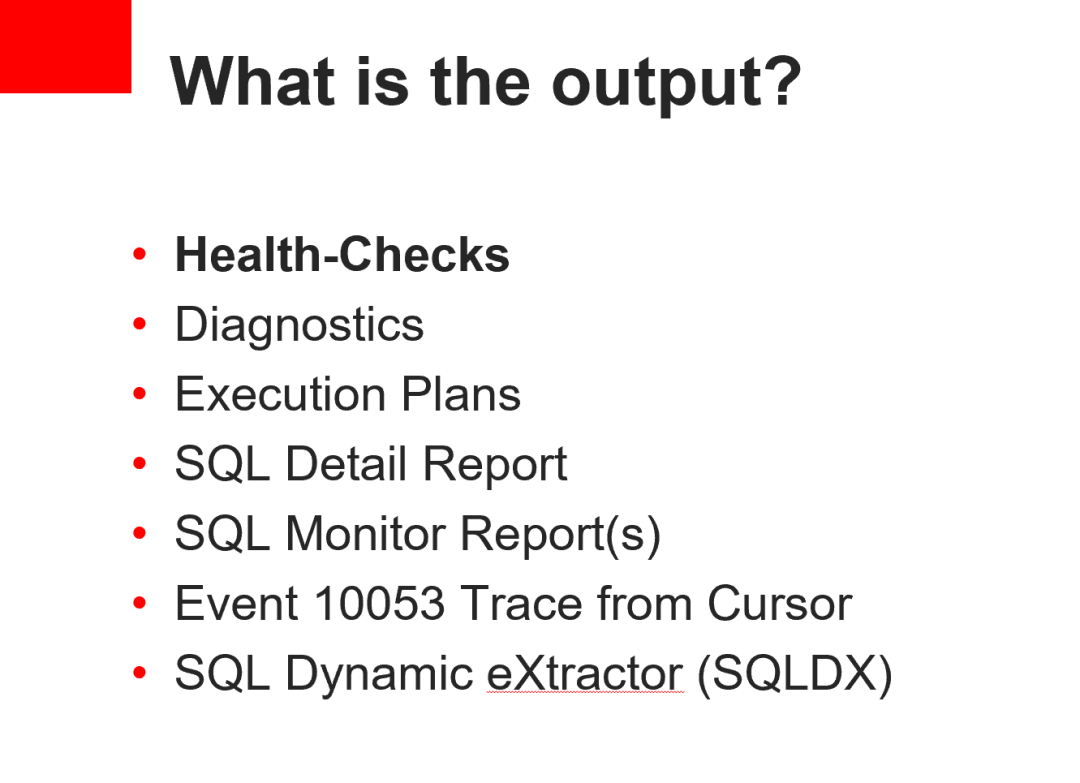 The SQL Tuning Health-Check Script is a tool developed by the Oracle Server Technologies Center of Expertise. The tool, also known as SQLHC, is used to check the environment in which a single SQL Statement runs, checking Cost-based Optimizer (CBO) statistics, schema object metadata, configuration parameters and other elements that may influence the performance of the one SQL being analyzed.