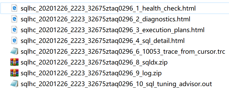 我们就会在当前路径下,得到一个压缩包,格式形如"sqlhc_年月日_时分_sqlid.zip",例如,sqlhc_20201226_2223_32675ztaq0296.zip,