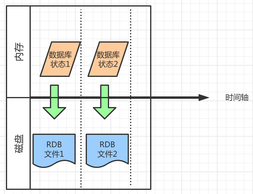 RDB是Redis Database 的缩写,其作用是在某一个时间点,将Redis存储在内存中的数据生成快照并存储到磁盘等介质上,存在这个磁盘介质上的文件就是RDB文件。“快照”顾名思义就是好像照相一样保存当时的数据,这里的RDB文件是一个二进制的文件,并且是经过压缩的。因为RDB文件是保存在硬盘中的,即使Redis服务器进程退出,甚至运行Redis服务器的计算机宕机,但只要RDB文件仍然存在,Redis服务器就可以用它来还原数据库状态。如图1 所示,可以想象Redis数据库在时间轴上有位于不同时间点的时候都有一个数据库状态,可以把它们想象成一个个切片。图上标注出两个时间点的两个数据库切片,RDB持久化做的事情就是顺着绿色箭头的方向将数据库状态的“切片”以RDB文件的形式保存到磁盘中。