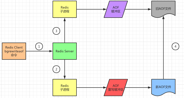 说完了AOF重写的定义以后,下面来看看AOF重写的流程。一般而言有两种方式可以执行重写操作,分别是:bgrewriteaof 命令和AOF重写配置。