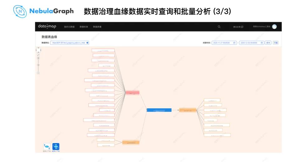 血缘数据批量分析:以某个租户、某个部门的表、某个产品的表为起始节点批量分析得到这些表的上游表和下游表的完整链路;大数据任务通过 Nebula Spark Connector 连接 NeublaGraph 批量导入点数据和边数据,使用基于 GraphX 实现的算法批量分析得到完整的血缘链路。