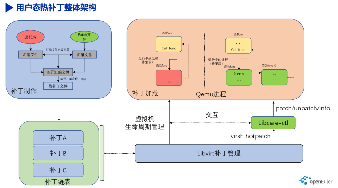 我们以 LibcarePlus Qemu 热补丁技术为例,进行相关介绍。热补丁的整体架构如下:
