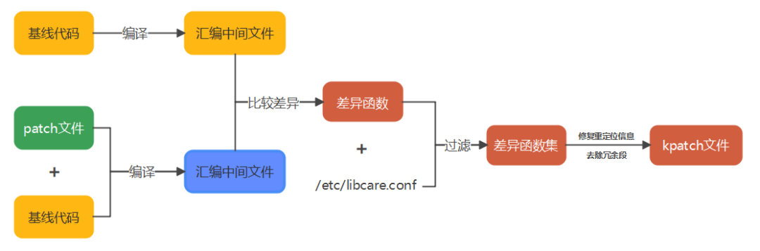 LibcarePlus 制作热补丁的基本原理是基于汇编级指令比较技术。LibcarePlus 通过比较基线代码生成的汇编中间文件和打了补丁的基线代码生成的汇编中间文件,找到两者之间的差异部分;再基于差异部分,去除冗余段和修复重定位信息,最终得到热补丁 kpatch 文件。在分析汇编差异的前,LibcarePlus 会基于一些关键信息将汇编内容分成函数块和变量块,然后通过比较函数块和变量块之间的差异,找到差异的函数和变量。补丁制作的大概流程如下图所示: