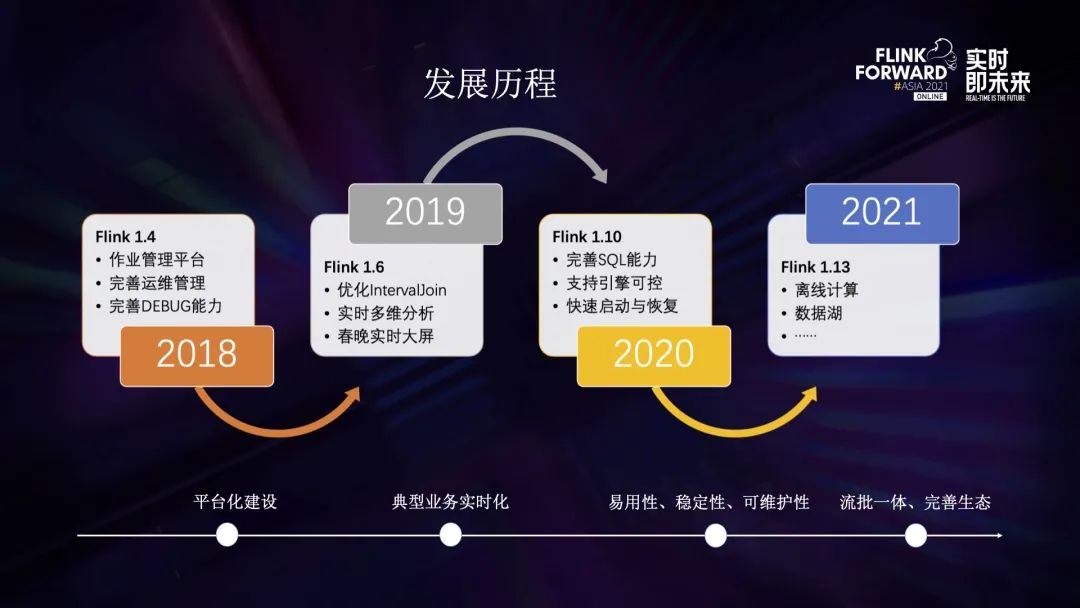 - 到了 2020 年,我们升级到 1.10,对 sql 的功能进行了非常多的完善,同时进一步优化 Flink 的核心引擎,保障了 Flink 的易用性、稳定性、可维护性。