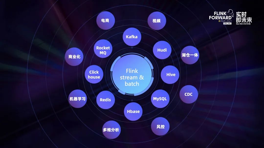 - 外面一层是跟 Flink 打交道的周边组件,既有 Kafka、rocketMQ 等中间件,也有 ClickHouse、Hive 等数据分析工具,还有 Hudi 等数据湖的使用。用户可以基于 Flink 和这些组件构建各种应用,涵盖了实时、近实时、批处理的各种场景。