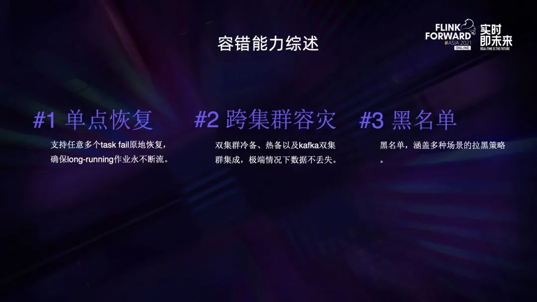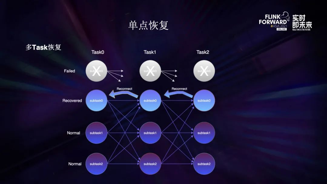 - 首先是单点恢复,支持任意多个 task 失败时的原地重启,long-running 作业基本可以做到永不断流;