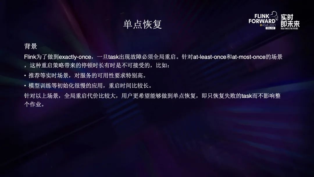 Flink 为了做到 exactly-once,任何节点出现故障都需要重启整个作业,全局重启会带来长时间的停顿,最高可达十几分钟。有些场景不追求 exactly-once,比如推荐等实时场景,但它们对服务可用性的要求很高,无法容忍作业的断流,还有模型训练等初始化很慢的场景,重启时间特别长,一旦重启将会造成很大的影响。基于以上考虑,我们开发了单点恢复功能。