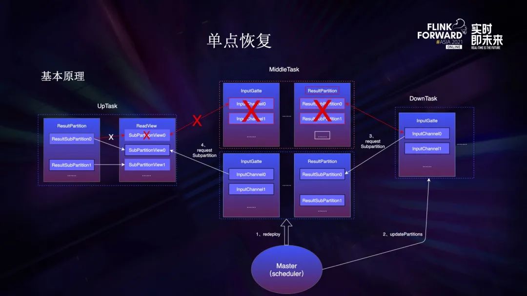 上图是单点恢复的基本原理。如图有三个 task,其中中间的 task 失败了,那么首先 Flink 的主节点会重新调度中间的 task,此时上下游的 task 不会失败,而是等待重连。等中间的 task 调度成功后,master 节点会通知下游的 task 去重连上游的 task,与此同时中间的 task 也会去连它上游的 task,通过重新构建读视图来恢复数据的读取。等上下游都连接成功后这个作业就可以正常工作了。