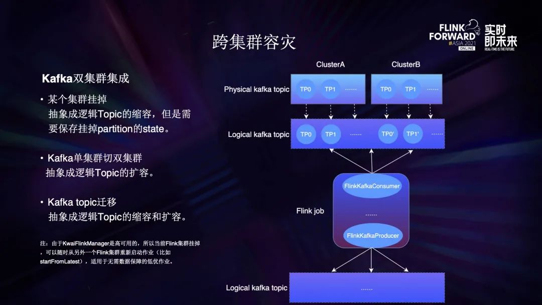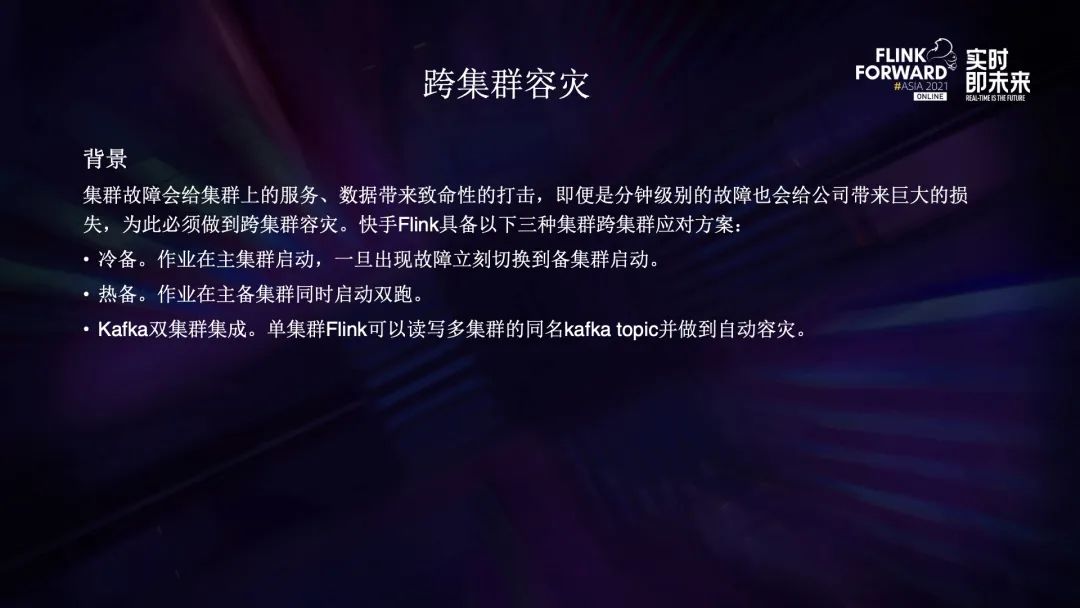 集群故障一旦发生就是致命性的,所有的数据都会流失,服务也会挂掉。我们的方案主要包含冷备、热备,以及 Flink 和 Kafka 的双集群集成。