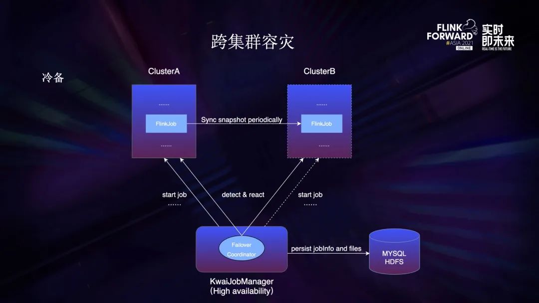 冷备主要指的是对数据做备份,集群挂掉以后可以快速在另外一个集群启动计算任务。如上图,KwaiJobManager 是快手的作业管理服务,其中的 failover coordinator 主要负责故障处理。我们会把所有 jar 包等文件保存在 HDFS,所有的信息保存在 Mysql,这两者都做到了高可用。作业运行在主集群 ClusterA,线上用的是增量快照,会存在文件依赖的问题,所以我们定期做 savepoint 并拷贝到备集群。为了避免文件过多,我们设置了定时删除历史快照。一旦服务检测到集群 A 故障,就会立刻在集群B启动作业,并从最近一次的快照恢复,确保了状态不丢失。对于用户来说,只需要设置一下主备集群,剩下的全都交由平台方来做,用户全程对故障无感知。