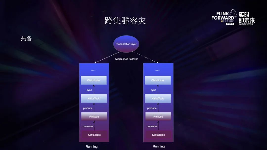 热备就是双集群同时运行一样的任务。我们的热备都是全链路的,Kafka 或者 ClickHouse 等都是双跑。最上面的展示层只会使用其中一份结果数据做展示,一旦出现故障,展示层会立刻切换到另外一份数据,切换过程在一秒以内,用户全程无感知。相比冷备,热备需要等量的资源来备份运行,但切换的速度更快,比较适用于春晚等要求极高的场景。