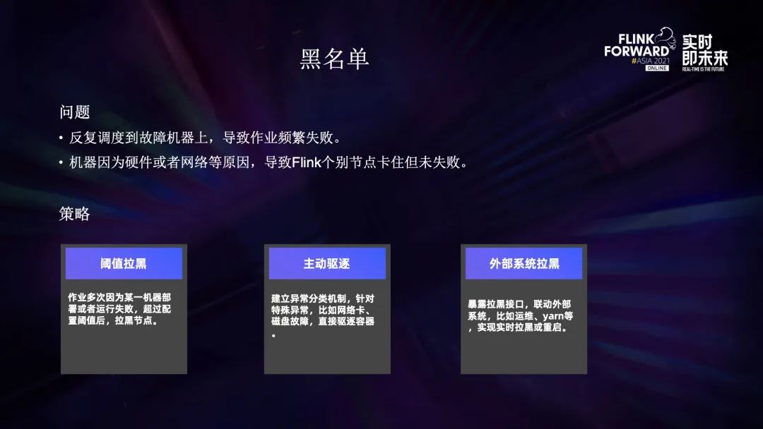 出现以下两种情况的时候需要使用黑名单功能。第一种是反复调度有故障的机器,导致作业频繁失败。另一种是机器因为硬件或网络等原因,导致 Flink 个别节点卡主但未失败。针对第一种情况,我们开发了阈值拉黑,如果作业在同一个机器上失败或者多次部署阈值失败,超过配置的阈值就会拉黑;针对第二种情况,我们建立了异常分类机制,针对网络卡顿和磁盘卡顿情况,直接驱除容器并且拉黑机器。另外我们还对外暴露了拉黑接口,打通了运维 Yarn 等外部系统,实现了实时拉黑。我们还以 Flink 黑名单为契机,建立了一套完整的硬件异常处理流程,实现了作业自动迁移,全程自动化运维,用户无感知。3.1 Flink实时控制