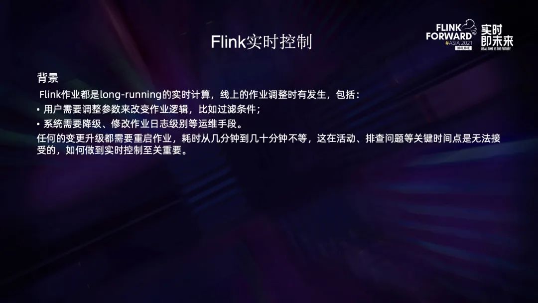针对 long-running 的实时作业,用户经常需要作出变更比如调整参数来更改行为,还有一些系统运维比如作业降级、修改日志级别等,这些变更都需要重启作业来生效,有时会高达几分钟到几十分钟,在一些重要的场合,这是无法容忍的。比如在活动期间或者排查问题的关键点,作业一旦停止将会功亏一篑,所以我们需要在不停止作业的情况下实时调整作业的行为,也就是实时控制。