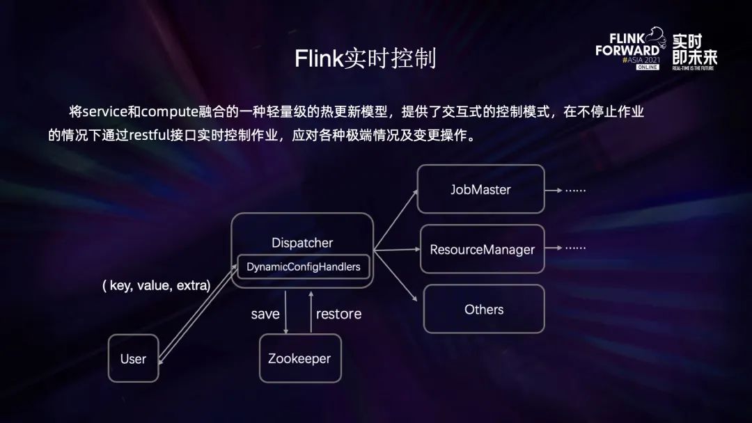 从更广泛的角度来看,Flink 不仅是计算任务,也是一个 long-running service。我们的实时控制正是基于这样的考虑,来为实时计算提供交互式的控制模式。如上图所示,用户通过经典的 kv 数据类型与 Flink dispatcher 交互,Flink 收到消息后,会先将它们持久化到 zk 用于 failover,然后根据具体的消息做相应的控制,比如控制 resource manager、控制 job master 或者其他组件。