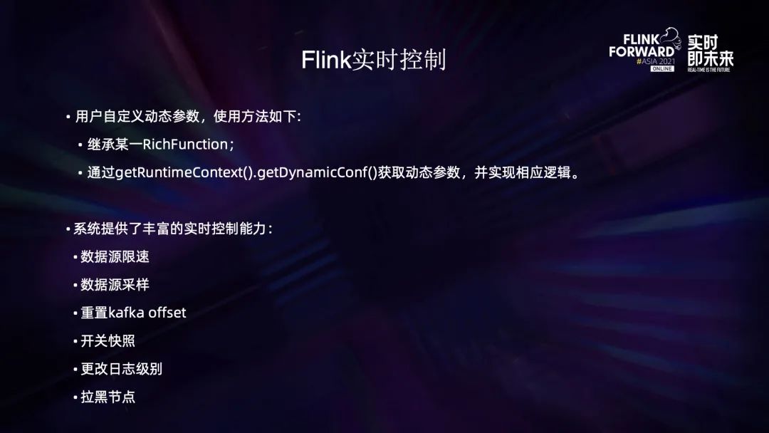 我们既支持用户自定义动态参数,也为用户提供了很多现成的系统控制。用户自定义主要是使用 RichFunction 来获取动态参数,并且实现相应的逻辑,这样在作业运行的时候就可以实时传入参数,达到实时控制的效果。系统提供的实时控制能力,主要包含数据源限速、采样、重置 Kafka offset、调整快照参数以及运维相关的更改日志级别、拉黑节点等功能。除此之外,我们还支持动态修改部分 Flink 原生配置。快手内部对实时控制功能实现了产品化,用户使用起来非常方便。3.2 源端控制能力