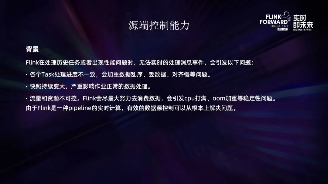 Flink 处理历史任务或者作业性能跟不上的的时候,会引发以下的问题:首先 source 的各个并发处理速度不一致,会进一步加重数据的乱序、丢失、对齐慢等问题。其次,快照会持续变大,严重影响作业性能。另外还有流量资源的不可控,在高负载的情况下会引发 CPU 打满、oom 等稳定性问题。由于 Flink 是一种 pipeline 实时计算,因此从数据源入手可以从根本上解决问题。
