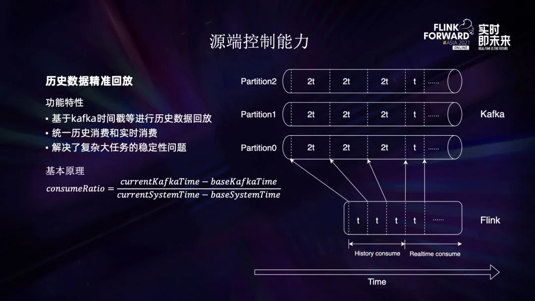 首先来看下历史数据精准回放功能。上图是以二倍速率去消费 Kafka 的历史数据,Flink 作业追上 lag 之后就可以转成实时消费。通过这种方式可以有效解决复杂任务的稳定性问题。上图的公式是一个基本原理,消费倍率 = Kafka 的时间差 Flink 的系统时间差,用户使用的时候只需要配置倍率即可。