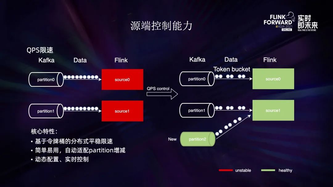 另外一个能力是 QPS 限速。数据流量很大的时候,会导致 Flink 的负载很高以及作业不稳定。我们基于令牌桶算法,实现了一套分布式的限速策略,可以有效减缓 Flink 的压力。使用 QPS 限速后,作业变得非常健康,上图绿色部分可见。19 年的春晚大屏,我们就是通过这个技术实现了柔性可用的保障。另外我们还支持自动适配 partition 的变更和实时控制,用户可以随时随地调整作业的 QPS。