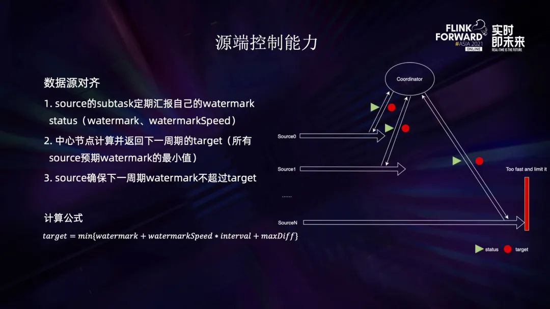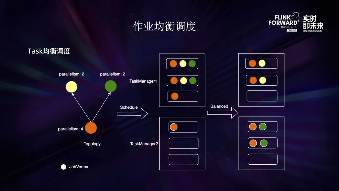 最后一个功能是数据源对齐,主要指 watermark 的对齐。首先每个 subtask 都会定期向主节点汇报自己的 watermark 进度,主要包括 watermark 的大小和速度。主节点会计算下一个周期的 target,即预期的最大 watermark,再加一个 diff 返回给各个节点。各个 source task 会保证下一个周期的 watermark 不超过设置的 target。上图最下面是 target 的计算公式,预测每个 task 下个周期结束时候的 waterMark 值,再加上我们允许的 maxdiff 然后取最大值,通过这种方式可以保障各个 source 的进度一致,避免 diff 过大导致的稳定性问题。3.3 作业均衡调度