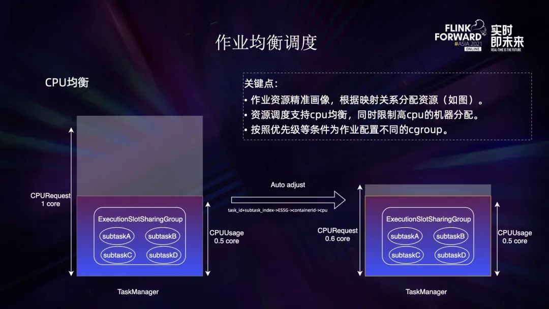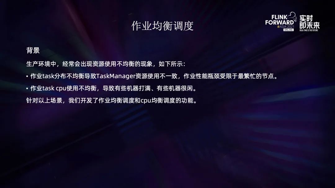 生产环境中经常会出现资源不均衡的现象,比如第一点 Flink 的 task 分布不均匀,导致 task manager 资源使用不均衡,而作业的性能又往往受限于最繁忙的节点。针对这个问题,我们开发了作业均衡调度的策略;第二点是 CPU 使用不均衡,有些机器被打满而有些机器很闲。针对这个问题,我们开发了 CPU 均衡调度的功能。
