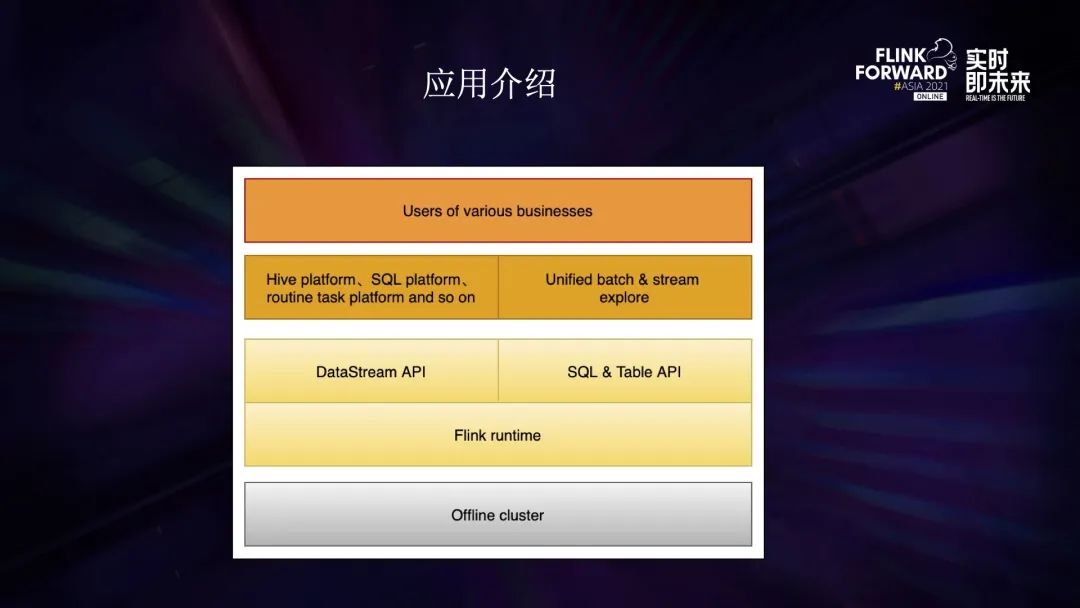 - 最外层是具体的使用场景,常见的有电商、商业化等视频相关的业务方,应用场景包含机器学习、多维分析等。另外还有很多技术部门基于 Flink 来实现数据的导入、转换,比如 CDC、湖仓一体等。