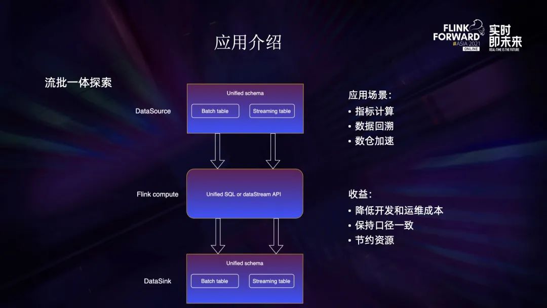 快手内部对流批一体进行了很多探索,我们为存储数据建立了统一的 Schema 标准,包括流表和批表,用户可以使用相同的代码来处理流表和批表,只是配置不同。产生的结果也需要符合统一的 Schema 标准,这样就可以打通上下游,实现尽可能多的逻辑复用。Schema 统一是我们快手数据治理的一部分,湖仓一体等场景也都有这个需求。流批一体带来的收益是多方面的,首先是降低了开发和运维成本,实现了尽可能多的代码逻辑复用,运维不再需要维护多个系统。其次是实时处理和批处理的口径保持一致,保障了最终结果的一致。最后是资源方面的收益,有些场景只需要一套实时系统。