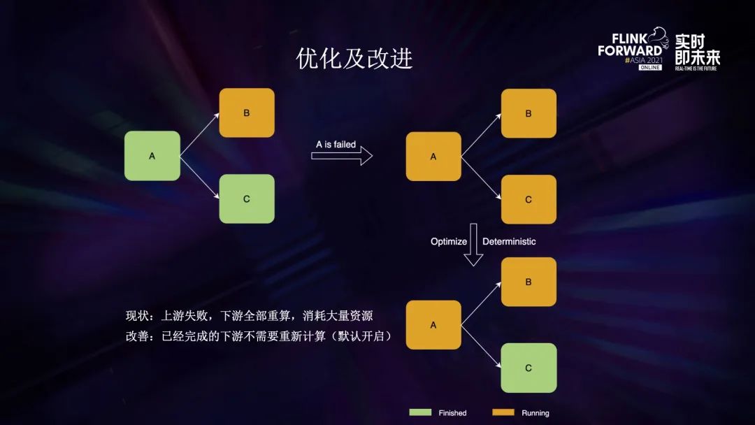 我们在调度方面进行了优化。如上图所示的三个 task,起初 a 和 c 已经完成,b 还在运行。这时 a 失败了,按照默认的策略 ABC 都需要重新运行,即便 c 已经完成。在实际场景中会有大量的 c 进行重算,带来巨大的资源损耗。针对这种情况如果,我们默认开启了以下策略:如果 a 的结果是决定性的(实际上大部分批处理的输出都是决定性的),可以不再重算 c,只需计算 a 和 b。