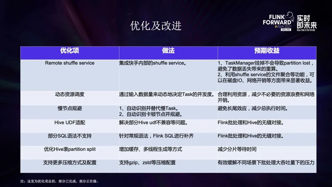 第一个是 shuffle service,现在既有内部的集成,也在试用社区的版本,主要是为了实现存储和计算的解耦,同时提高 shuffle 的性能。第二个是动态资源的调度,主要是根据数据量来自动决定算子的并发,避免人工反复调整。第三个是慢节点规避,也叫推测执行,主要是为了减少长尾效应,减少总执行时间。第四个是 hive 的优化,比如 UDF 适配、语法兼容。另外针对 partition 生成 split,我们增加了缓存、多线程生成等方式,极大减少了分片的时间。最后是一些压缩方式的支持,比如支持 gzip、zstd 等。