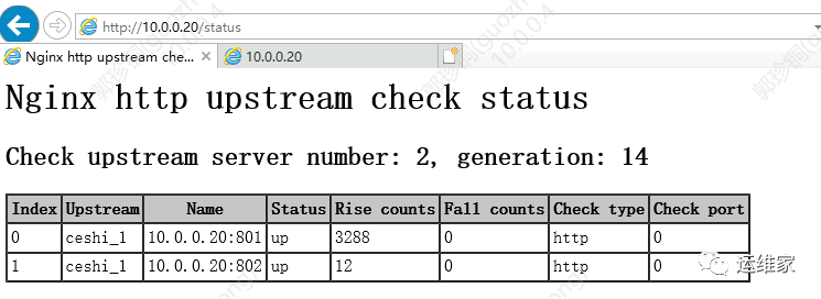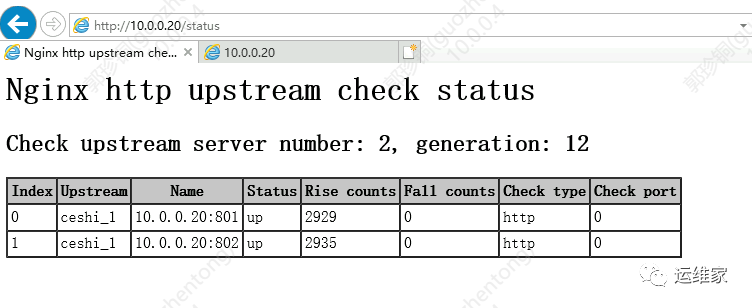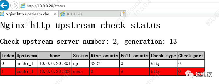 信息status:节点状态,up是可用,down是不可用 rise counts:探测次数 fall counts:满足次数 check type:探测协议是什么,分为http和tcp两种 check post:指定后端服务器中的检查端口,它可以与原始服务器端口不同,默认端口为 0,表示与原始后端服务器相同