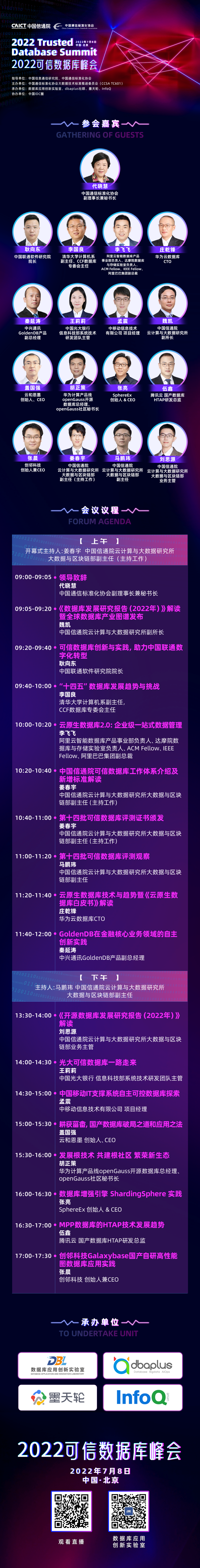 作为信通院首届可信数据库峰会,本届峰会将邀请行业协会领导、知名高校教授、产业链各环节数据库负责人、资深技术专家共同论道数据库发展之路,探索新形势下我国数据库产业持续性提升质量、效率与效益的方法。