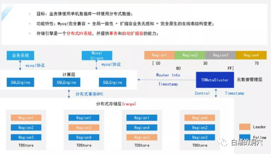 TDStore也采用了与国内比较著名的分布式数据库TIDB和OceanBase的LSM-TREE存储结构,放弃了TDSQL以前使用的代理模式SHARDING数据库的架构。如果不仔细看,上面那张图可能还会被误以为是TIDB的架构图呢。稍微分析了一下TDStore的一些基本特性,我也看到了一些致敬TIDB/OB这两个老前辈的地方。比如分布式存储层是按照Range分区的,而没有采用全局一致性HASH,另外微块压缩也是前人已经趟过的路。