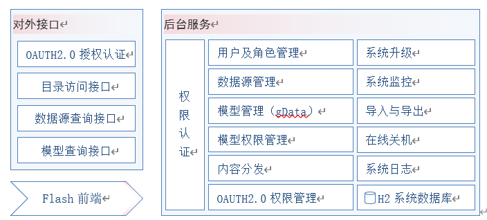 GBaseBI是基于B/S构架,浏览器端负责数据查询设计和展示,服务器端提供数据查询等服务,产品模块在上一章产品构架节中得出,产品包括门户、吉阅、吉查、吉图和BIServer和数据查询gData模块,gData模块对用户是透明的,本章将详细介绍各个模块的构架和主要特色功能。