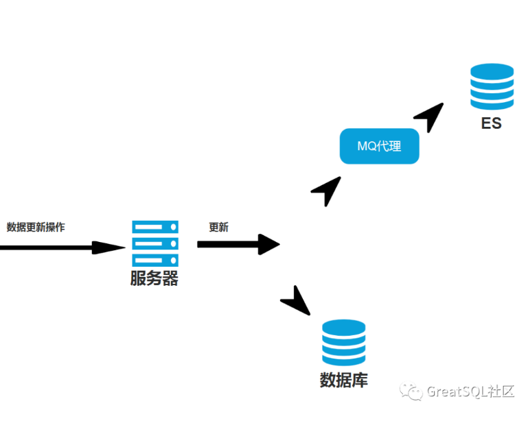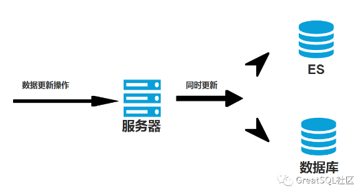 第一种方式十分直接,当发生对GreatSQL数据的更新操作时,由服务器对GreatSQL和ES同时进行更新操作,如图: