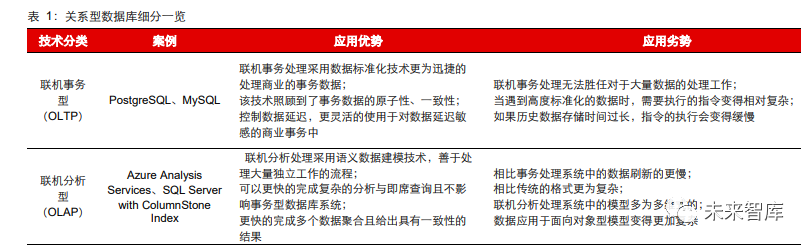 关系型数据库的基层单位是由二维的行列分部组成的表格,一个关系型数据库往往可以 涵盖多个行列分部表格。表格中每一行分布代表了一条独特的数据记录,而各列则代表 了同一数据记录的不同特性。通过多种来源获取的数据最后会通过抽取、转化、加载后 整合进一个数据仓库之中。关系型数据库根据其数据处理技术的不同又可以分为联机事 务型数据库与联机分析型数据库。