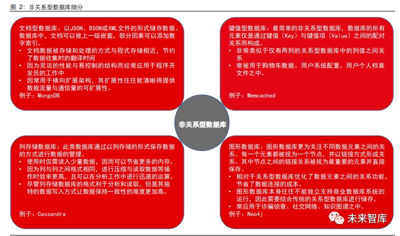 非关系型数据库采用了更为灵活的数据结构,并且可以横向到达多个处理器,这吸引了 更多需要处理超过单一服务器数据流量的厂家。以功能划分,非关系型数据库可以分为 文档型数据库、键值型数据库、列存储数据库、图形数据库四种。