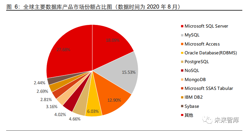除这几款数据库技术之外,其余得分较低的数据库产品仅占行业较小份额。虽然行业市 场已由 Microsoft、Oracle、SAP、IBM 通过多种不同产品占据了近六成的份额,但这四 大龙头企业之间竞争依然激烈。例如,Microsoft 曾为争夺市场份额,对将数据从 Oracle 数据库迁徙至微软数据库的用户提供免费的授权许可。
