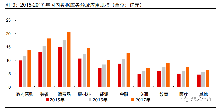中国数据库产业虽然较国际市场起步晚,但是经过三十多年的发展,也逐步成熟。中国 国产数据库产业已经基本应用在了政府、军队、金融、交通、科技等多个领域。目前数 据库软件的上游主要由计算机硬件设备组成,而该行业的下游需求市场主要体现在消费 品、装备、政府采购领域。2017 年,相较上一年全数据库软件应用领域的平均增长达到 18.91%。