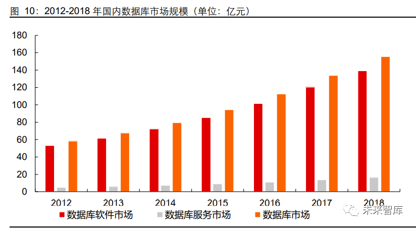 参考智研咨询的数据,截止至 2018 年,中国数据库市场共有 155.59 亿元市场规模,其 中 139.25 亿元为数据库软件市场,其余为数据库服务市场。