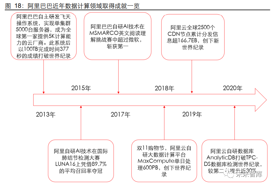 阿里巴巴拥有非常全面的数据库产品内容,其中包括关系型数据库 PolarDB、PolarDBX、OceanBase 等,非关系型数据库 Lindorm,云原生数据仓库 AnalyticDB。这些数据 库产品几乎涵盖了所有开源性质的不同数据库种类,并且有效兼容了 Oracle 等商用数 据库的内容,为公司未来进一步带动数据库市场“去 IOE 化”打下了坚实的基础。