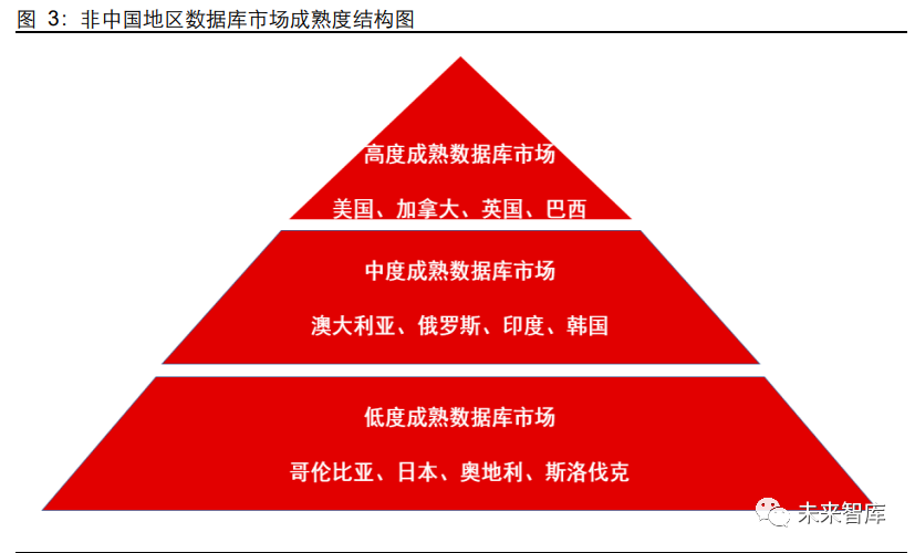 从地理分部维度来看,目前全球数据库市场中呈现着以北美与欧洲地区占多数,亚太地 区与拉丁美洲作为新兴市场的整体地理分部趋势。海外市场中,尚未高度成熟的国家与 地区在未来仍然有潜在的较快的成长趋势。