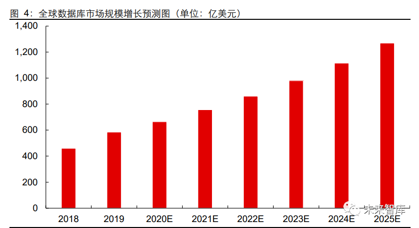 2019 年全球数 据库行业市场规模已达到 584 亿美元。未来五年,全球数据库市场可以继续保持复合年 增长率 13.81%的高速增长趋势, 2025 年市场规模将达到约 1269 亿美元。